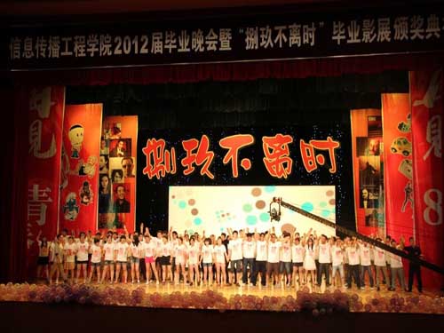 2012届毕业晚会暨“捌玖不离时”毕业影展颁奖典礼的成功举办,突出了我院的办学特色与专业优势,彰显了我院理论加实践相结合的教学成果和高素质应用型人才的培养成果,也顺成了教育现代化和学习化社会发展的历史潮流,同时也为2012届毕业生的大学生活画上了一个圆满的句号。虽然他们即将离开学校,但他们大学生活的点点滴滴将和学校永存。我们忠诚的祝福他们前程似锦早日实现自己的理想。
