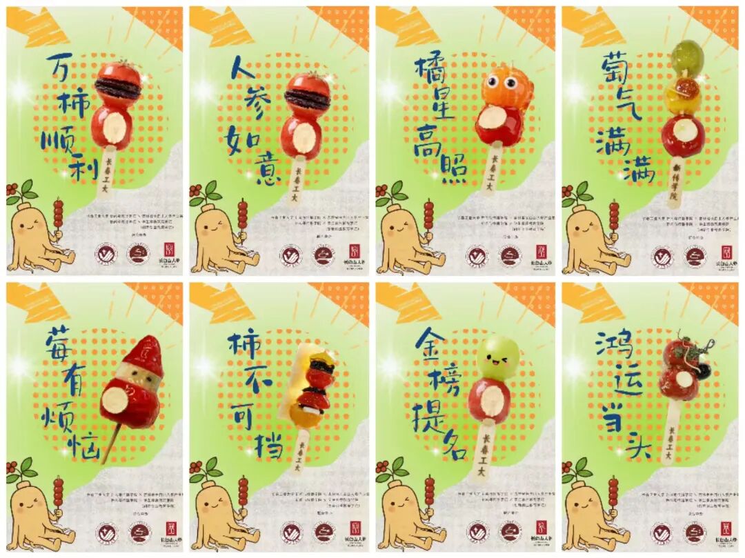 的师生们化身“文创匠人”,从食材甄选到造型设计全程亲力亲为。精选颗粒饱满的本地山楂,搭配营养价值丰富的长白山人参,经过去核、串制、熬糖、裹衣等多道工序,别出心裁的与人参蜜片、人参冻干片、人参花、人参粉、人参须等进行创意结合,制作出造型别致、酸甜可口的人参糖葫芦(人参如意)。除经典原味外,现场还推出了晴王葡萄(金榜题名)、丹东草莓(莓有烦恼)、圣女果(万柿如意)、砂糖橘(橘星高照)、奶皮子等创新口味,这些口味不仅满足了不同师生的味蕾需求,更饱含着学院对广大师生特别是即将踏上征途的考研同学们的真挚祝福。更有师生发挥专业特长,在糖葫芦包装上融入长春工业大学等相关元素,制作出兼具纪念意义与观赏价值的文创设计,让小小的糖葫芦成为承载校园文化的移动名片。